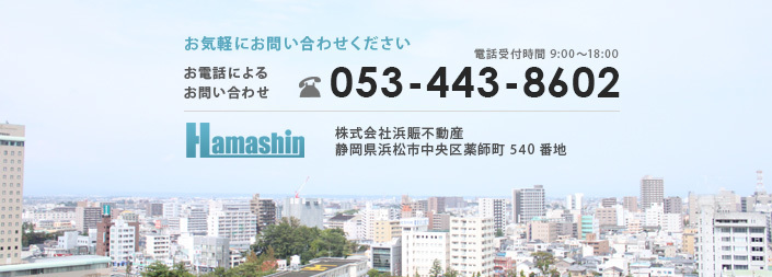 その他、何かご不明な点等ございましたら、お気軽にお問い合わせ下さい。 株式会社浜賑不動産 〒435-0017 静岡県浜松市中央区薬師町540番地 TEL 053-443-8602 FAX 053-443-8653